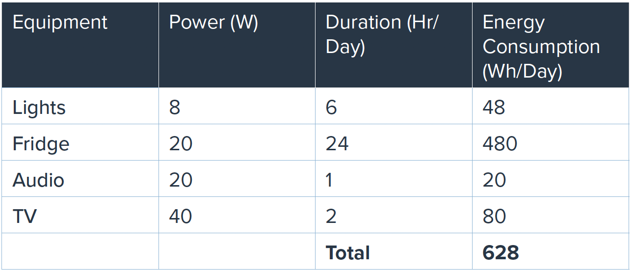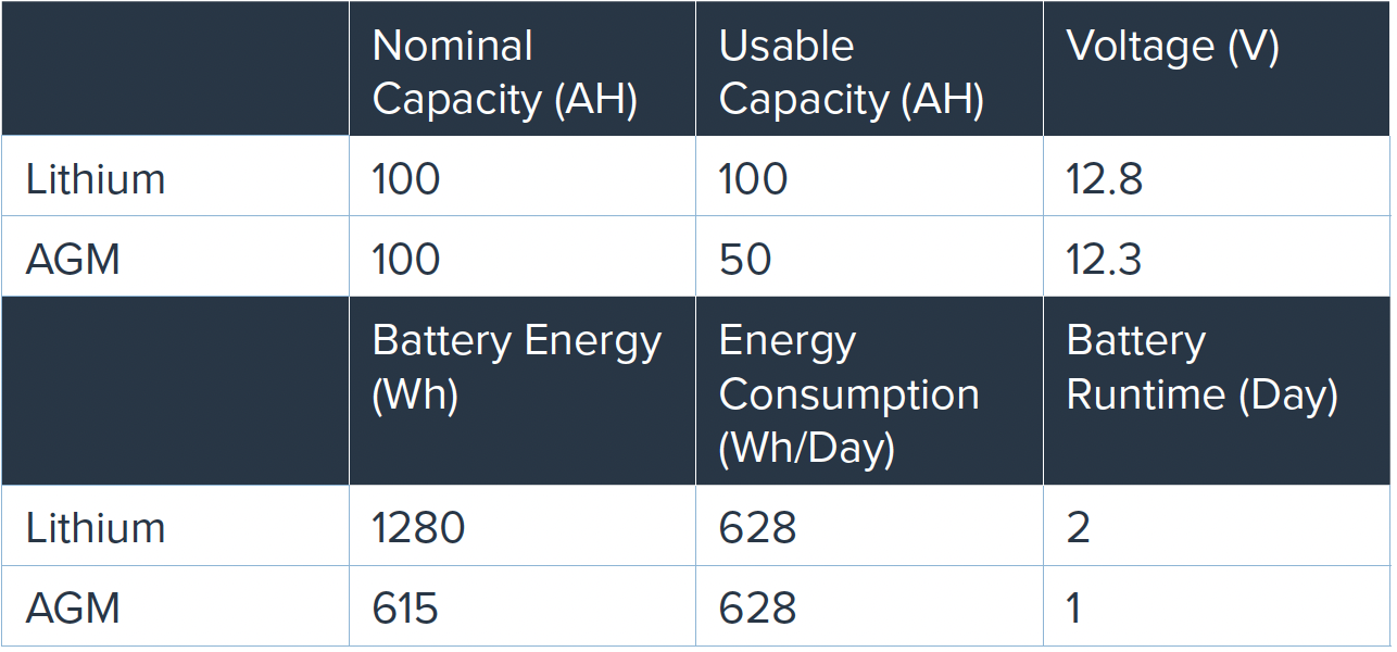Example: A 100AH Lithium Deep Cycle Battery with a load of 628Wh per day, should provide sufficient charge for approximately 2 days. See tables below.